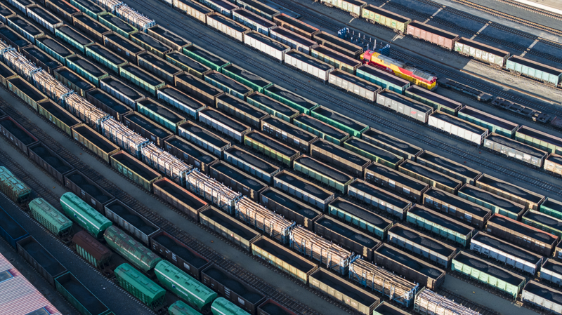 中国铁路哈尔滨局集团有限公司绥芬河站南场,满载货物的列车等待解体换装。 新华社发(曲艺伟 摄)